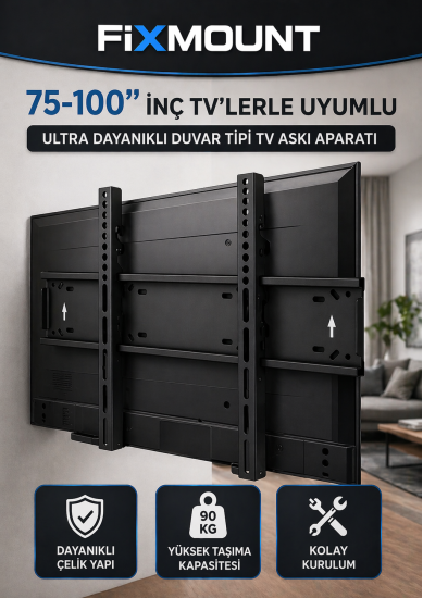 FIXMOUNT 75-100 İnç TV Askı Aparatı, büyük ekran televizyonlar için özel olarak tasarlanmış, sağlam ve güvenli bir duvar askı çözümüdür. Dayanıklı çelik gövdesi sayesinde televizyonunuzu duvara sabitleyerek hem yerden tasarruf sağlar hem de modern ve şık bir görünüm sunar.
